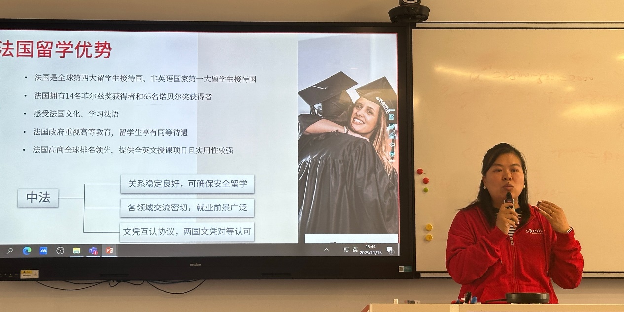 杨娟在Matthieu Dumont的基础上进行了更深入的介绍。她强调,法国作为第四大留学生接待国,留学生可以感受法国文化、学习法语。并且当前中法关系稳定良好,各领域交流密切,就业前景广阔,是学子们出国留学的颇优去处。值得一提的是SKEMA商学院秉持着同我院相似的实践与理论相结合的培养思想,将实习、竞赛融入课程之中,定期开展对当地公司的访问活动,为学子们未来的工作生活奠定丰厚的基础。